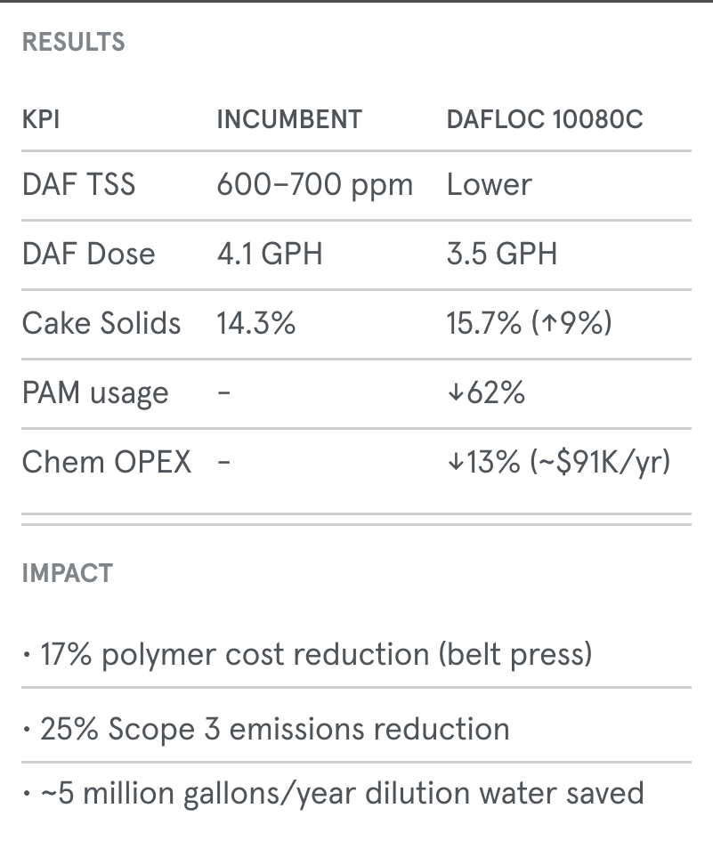 The facility runs DAF clarification and sludge dewatering to manage high-strength dairy effluent. It needed a chemistry program that could improve TSS control, increase cake solids, and reduce polymer volumes—all without overhauling existing infrastructure.
